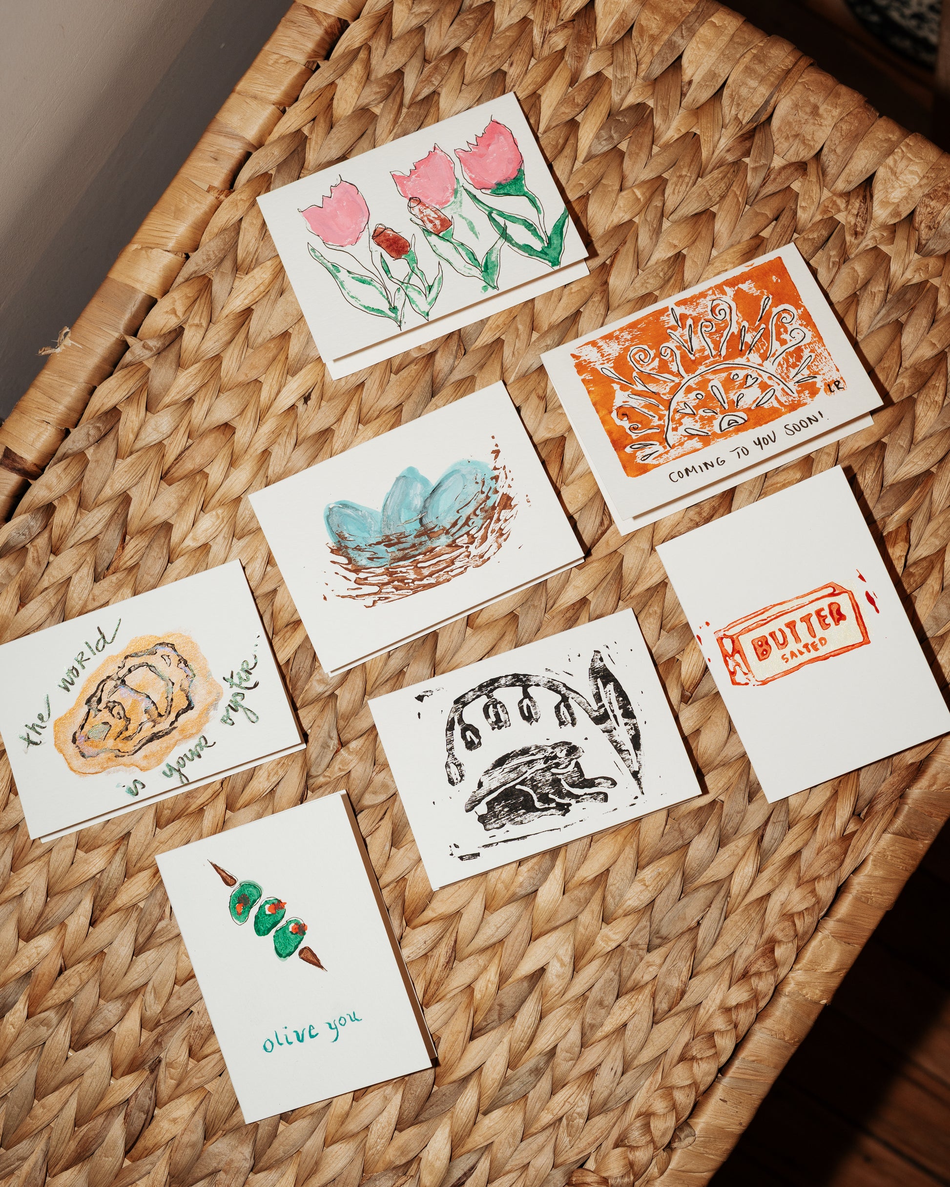 - Create 4 custom greeting cards with envelopes, using watercolor and linoprint techniques
