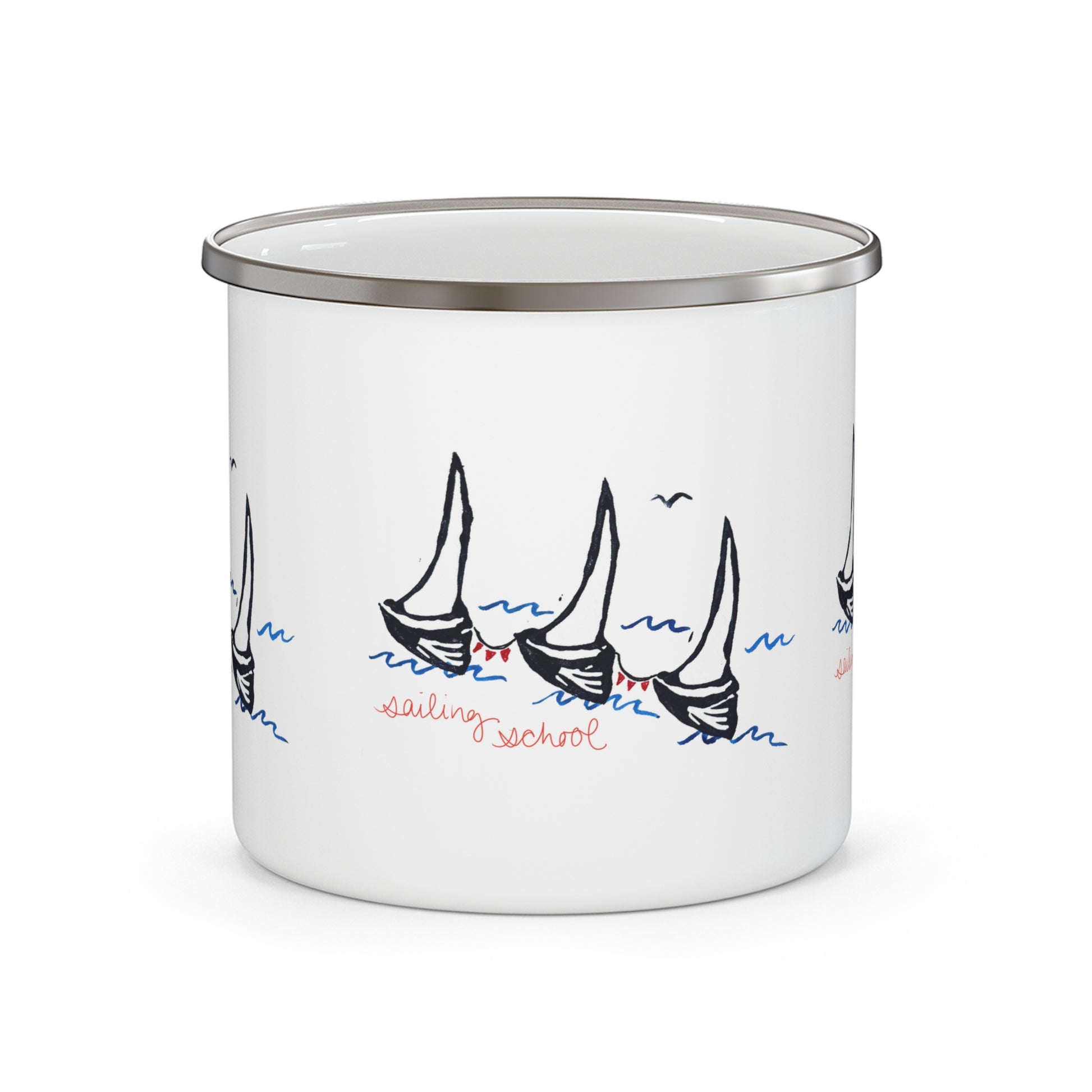 It's time for the Wednesday night races! Elevate your boating and camping adventures with a charming enamel mug, featuring original linocut and watercolor artwork by Paige Luethy.