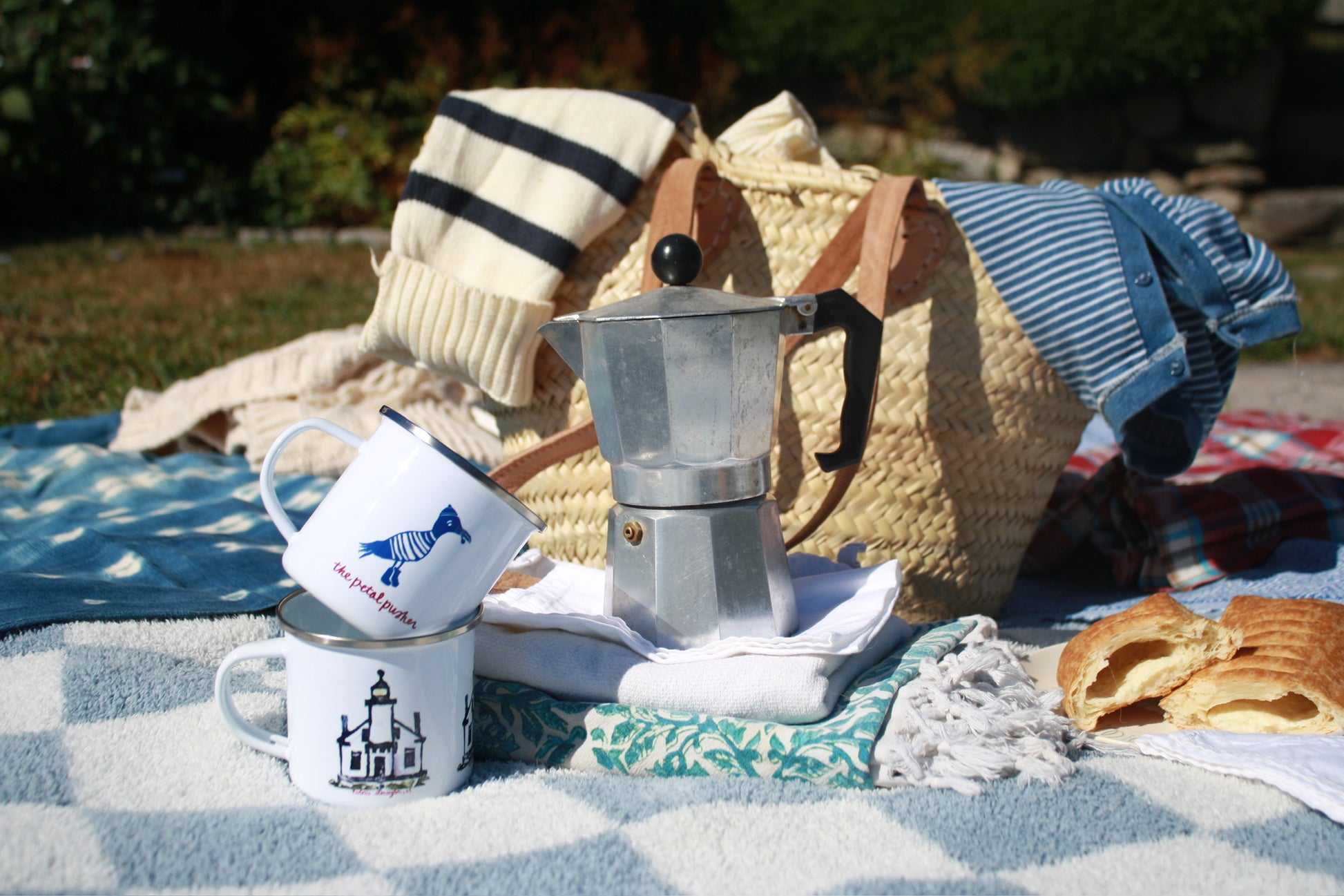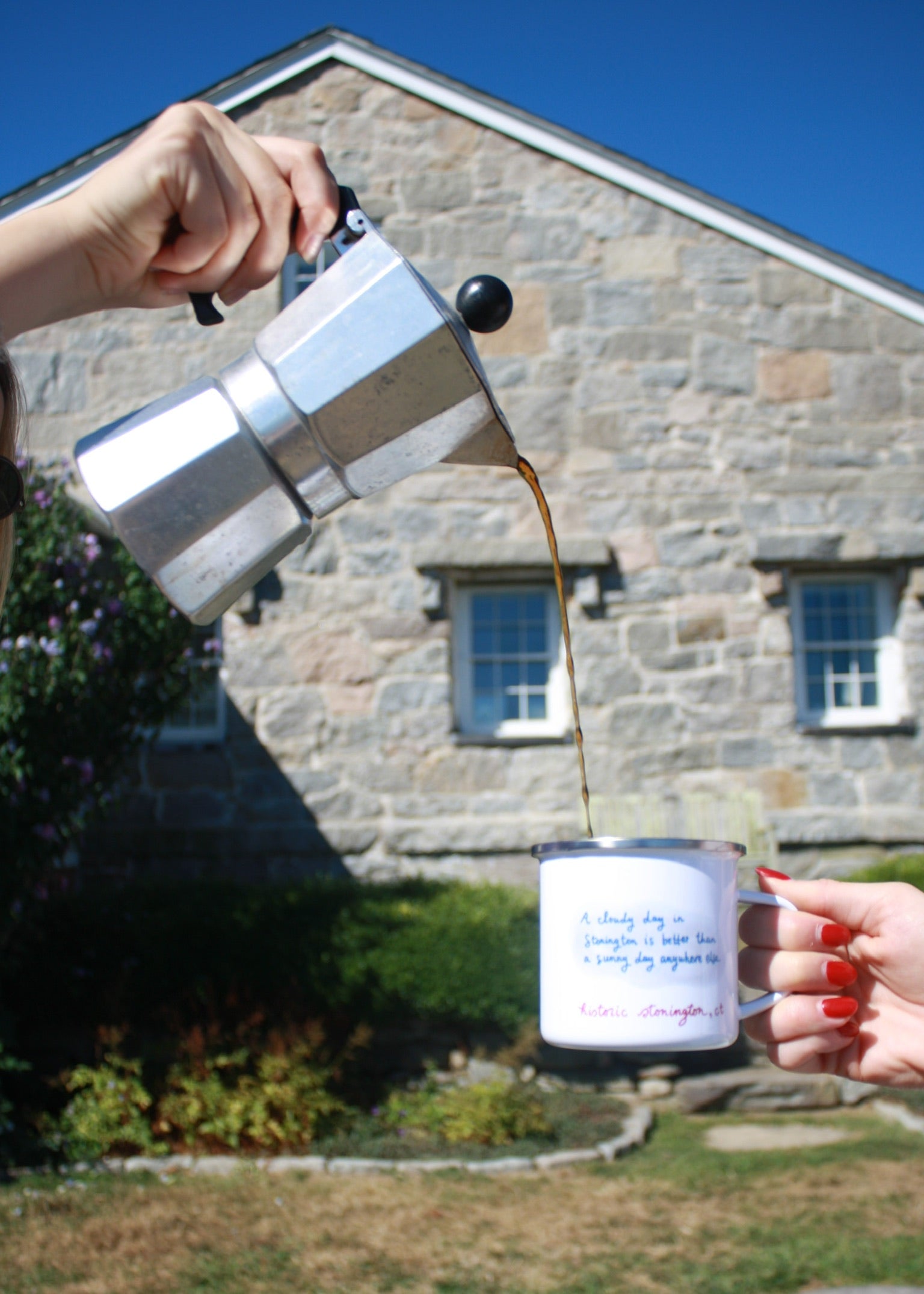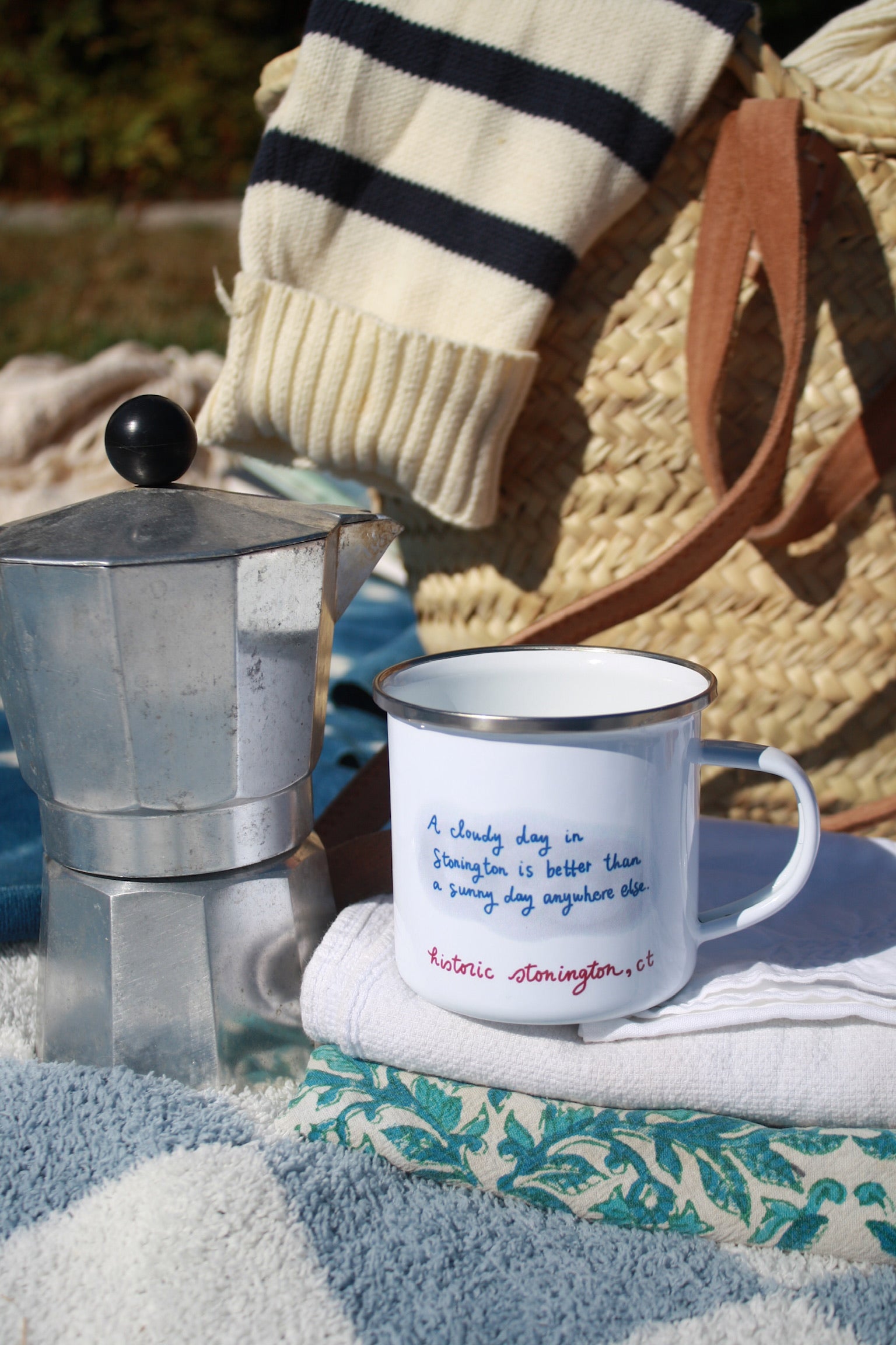 A cloudy day in Stonington is better than a sunny day anywhere else! Elevate your boating and camping adventures with a charming enamel mug, featuring original linocut and watercolor artwork by Colette Brown.