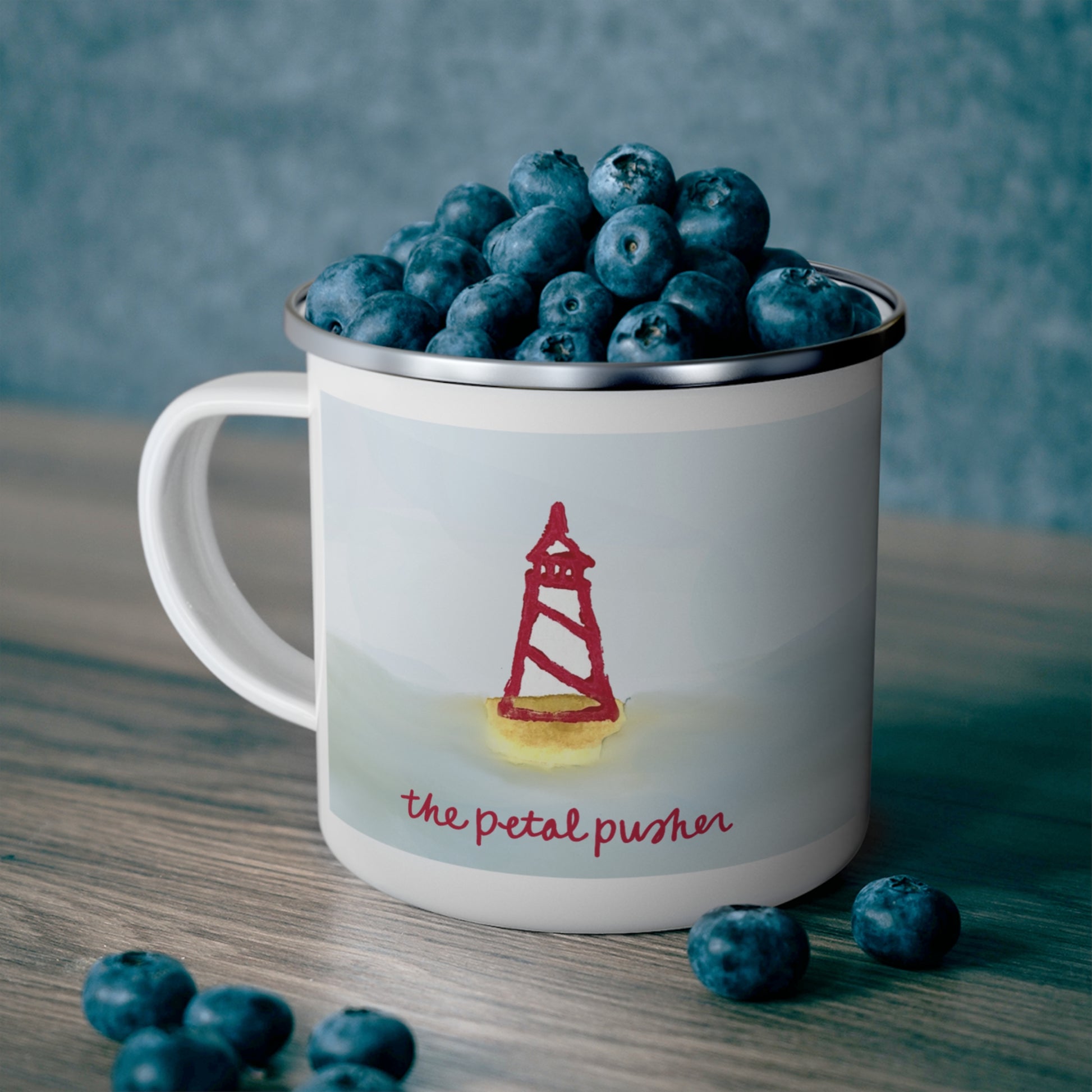 Nautical stripes meet quintessential New England! Elevate your boating and camping adventures with a charming enamel mug, featuring original linocut and watercolor artwork by Colette Brown.