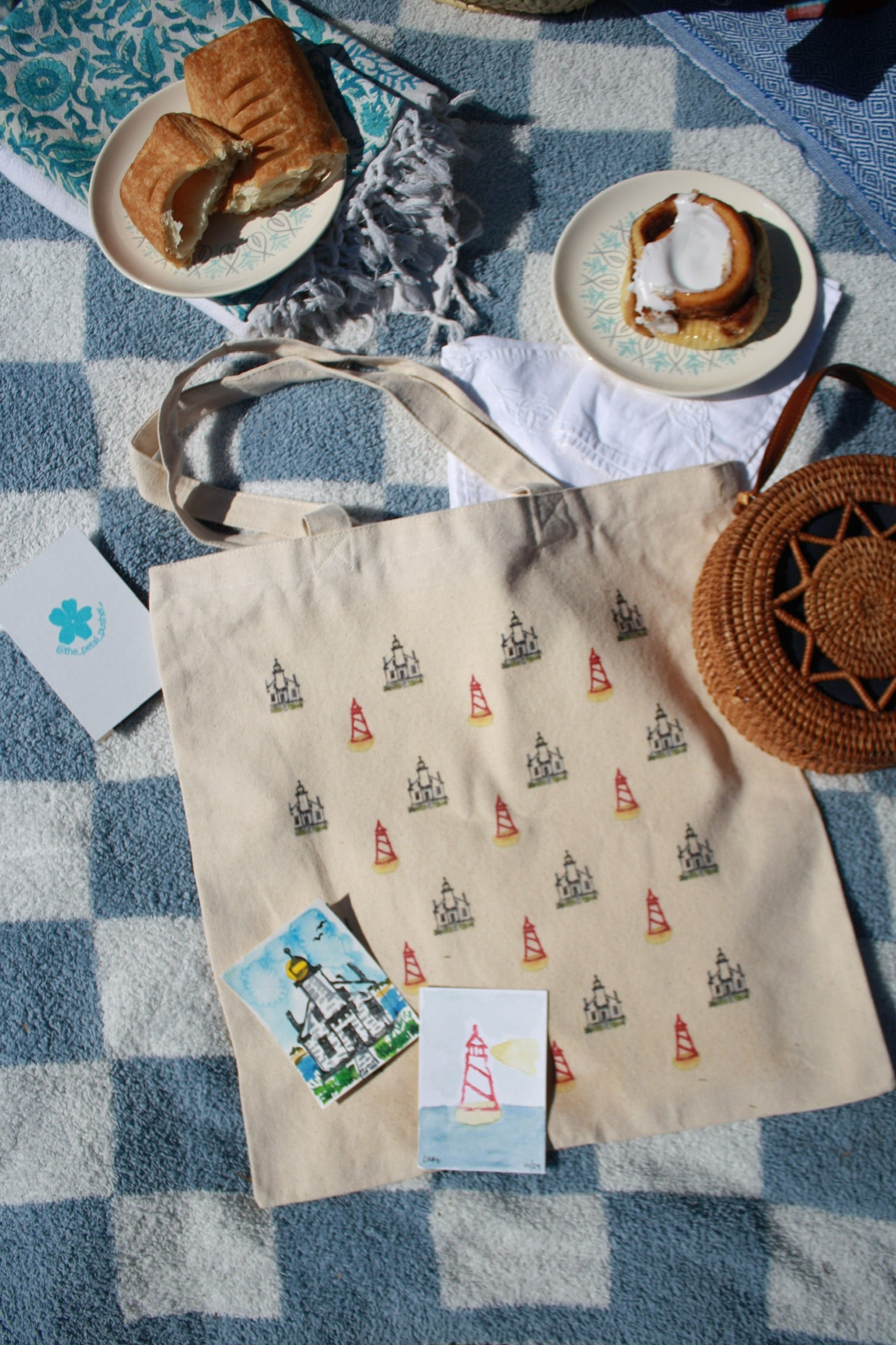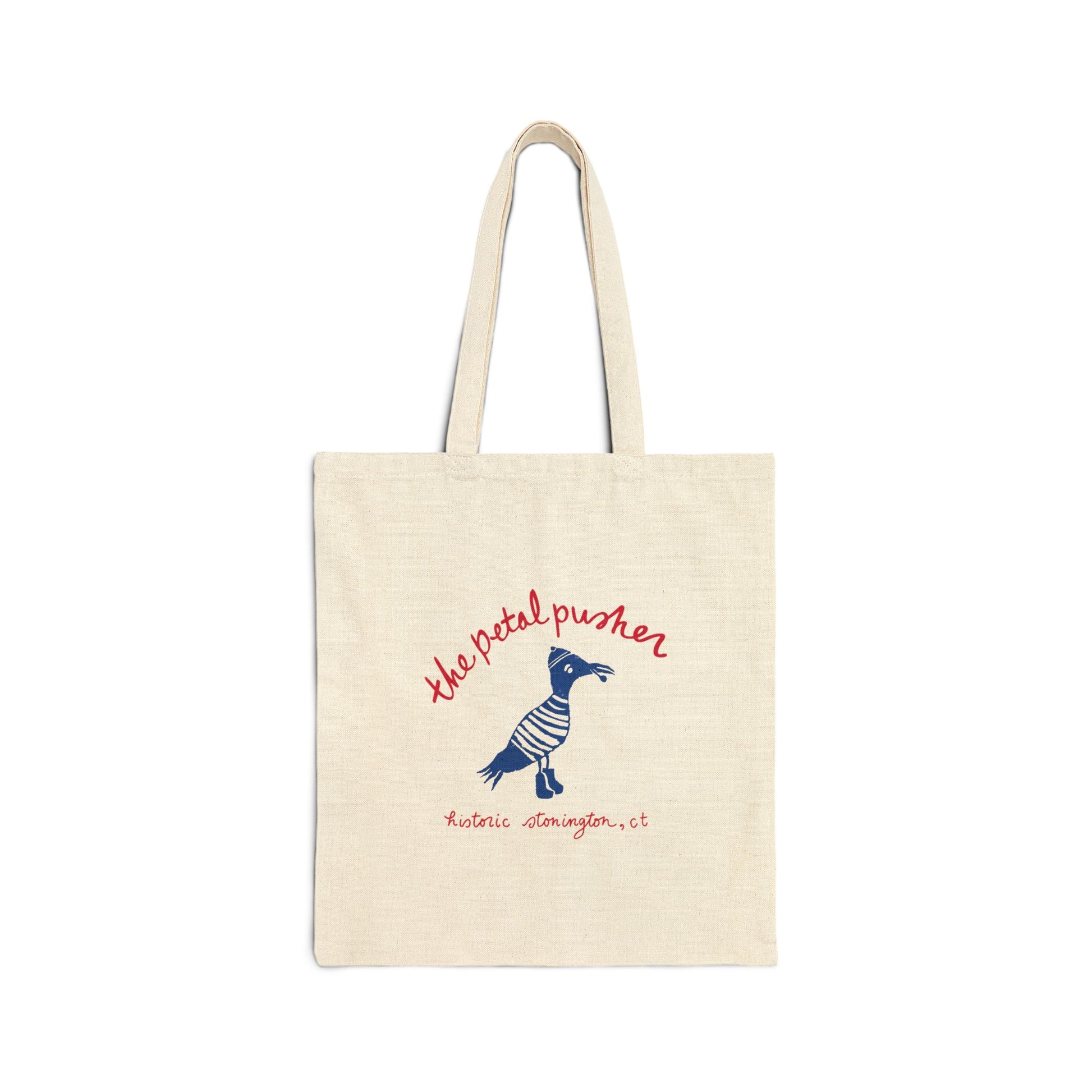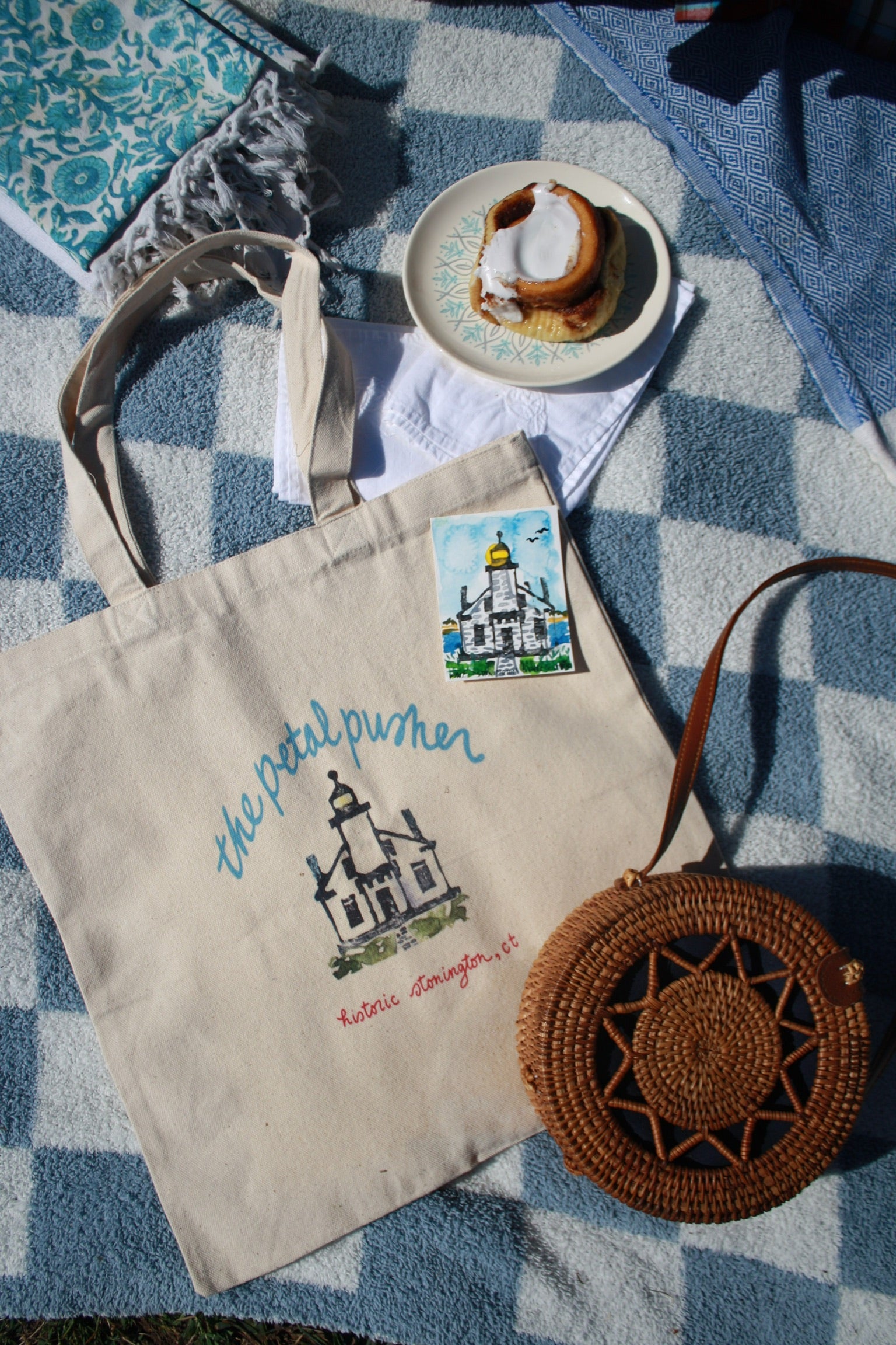 Celebrate the heritage of Stonington and the joy of our original artwork vending machine with The Petal Pusher x the Lighthouse Museum collection! Upgrade your daily routine with this 100% cotton canvas tote bag, featuring original linocut and watercolor artwork by Colette Brown and Paige Luethy.